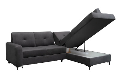 • Narożnik z pojemnikiem na pościel – praktyczny schowek na koce, poduszki i odzież sezonową