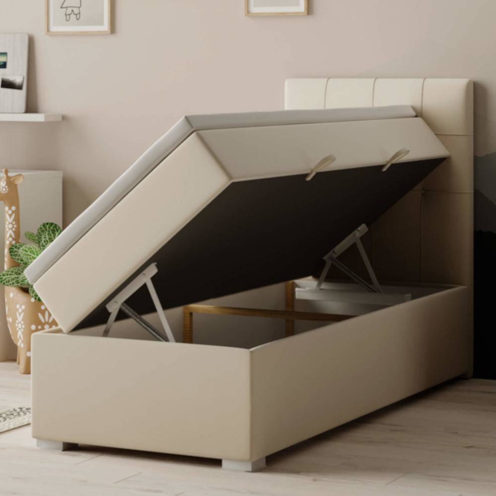 Bardzo ważną rolę w życiu każdego dziecka pełni zdrowy sen. Łóżko kontynentalne Deniz 80x200 cm wyposażone w materac bonelowy oraz piankowy topper ze zdejmowanym pokrowcem - z całą pewnością taki sen może zapewnić. Pod stelażem materaca znajduje się pakowna skrzynia na pościel, która zmieści również koce, swetry i szereg innych rzeczy. które do tej pory zalegały na dnie szafy. Łóżko posiada pikowane, miękkie wezgłowie pozwalające na swobodne oparcie się o nie w trakcie czytania książki czy przeglądania tabletu. Mebel można dopasować do pokoju młodzieżowego wybierając odpowiedni materiał obiciowy z szerokiego wzornika tkanin znajdującego się w naszym salonie.